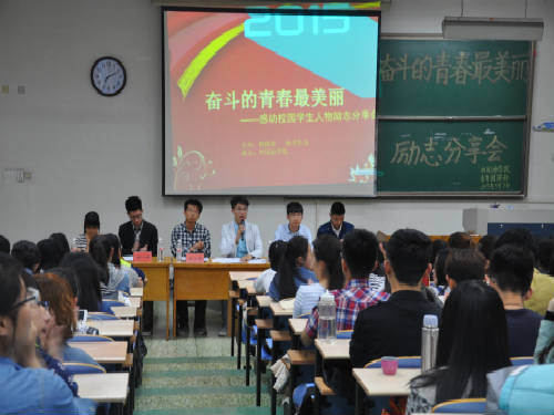 为积极响应学校“寻找榜样,学习榜样,争做榜样”号召,激励广大同学发现身边可信、可学、可比的青春典型,引导学生自觉践行社会主义核心价值观,5月7日晚,由校团委、校学生会主办,外国语学院青年团建部承办的“奋斗的青春最美丽”——2015感动校园学生人物励志分享会于4号教学楼201教室举行。此次励志分享会议邀请了用磨砺创造未来的孔凡厚、一路前行完成出彩创新路的卞玉帅、致力于特殊教育的电气爱心社负责人董学鹏、品学兼优的追梦人刘一铭及外国语学院优秀考研学生王艺颖分享个人奋斗史,刘永康负责主持,部分外国友人及外国语学院部分学生参加此次分享会。