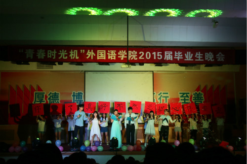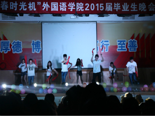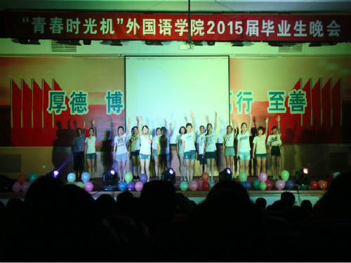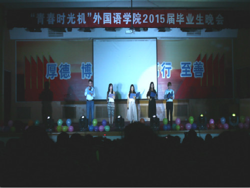 6月22日晚,外国语学院2015届毕业生晚会于3号教学楼报告厅举行。晚会别开生面,以“青春时光机”主题团课的形式,分为“时光机——蝉鸣的夏季”“任意门——放肆的青春”“竹蜻蜓——未来的旅行”三个版块,为毕业生们带来大学的最后一堂团课。学院党总支书记李义勇、院长李静、学院相关负责人及辅导员等观看毕业晚会。全体2015届毕业生参与晚会。