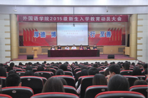 9月25日晚,外国语学院2015级新生入学教育动员大会于3号教学楼报告厅举行。外国语学院党总支书记李义勇,院长李静,党总支副书记卢彦峰,副院长王明新、卢连伟、牛书田,团总支书记曹晓媛及各系主任、班级导师和15级全体新生参加此次会议。