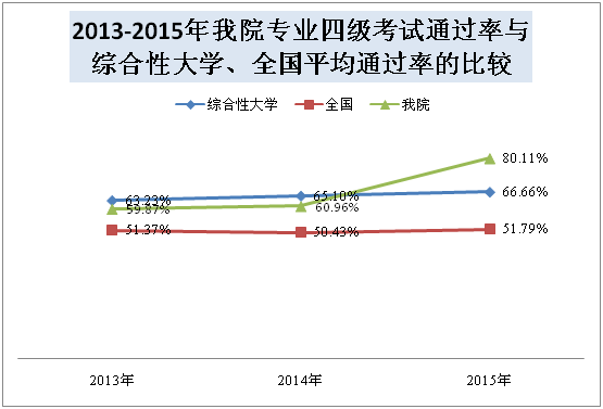 近年来,我院按照准确定位、注重内涵、突出优势、强化特色的原则,积极推进专业人才培养模式改革。积极进行基于专业知识、技能和素养的课程群建设,逐步形成优化的课程与教学体系;积极搭建外语实践平台,构建实践性教学环节、学生第二课堂活动、专业性社会实践活动为一体的立体化实践平台,为实现学生所学外语书本知识向应用能力的衔接和转化提供了可操作的有效途径,使教学质量得到进一步的提高。近几年来英语专业学生的四级、八级通过率一直保持比全国通过率高的好成绩。(外国语学院教学管理科)