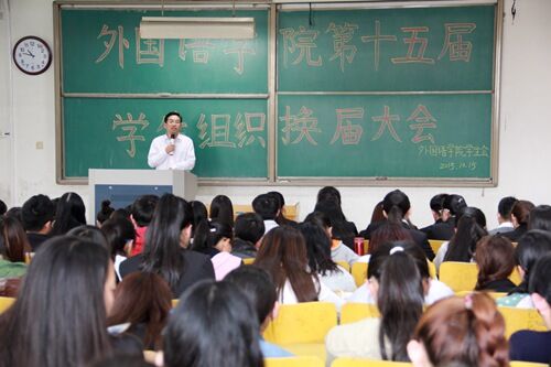 为继承上届学生组织工作的优良传统,顺利开展本学期工作,10月15日下午,外国语学院第十五届学生组织换届大会于3号教学楼202教室举行。学院党总支书记李义勇,团总支书记、学生科科长曹晓媛,辅导员朱婷婷、吴鹏及第十四届、第十五届学生组织全体成员参加会议。曹晓媛主持会议。