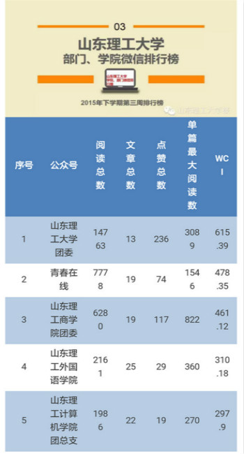 11月10日下午,微信公众号“南方周末数据实验室”更新消息,由学院新媒体工作室自主运营维护的学院官方微信“山东理工外国语学院”(sdut_waiyuan)在中国高校微信排行榜之院系TOP50中荣获第24名的好成绩,这是我校首个院系微信公众号荣登该光荣榜;据校报最新统计,该微信平台位列全校院级微信平台第2名,学校第4名;近十天,推送信息日阅读总量三次破千,学院网络思想政治教育再上新台阶。 据悉,学院始终坚持以党的十八大精神及习近平总书记重要讲话精神为指导,按照共青团中央相关精神及校团委的工作部署,以“目标明确、特色突出、思路创新、技术到位、实效鲜明”为原则,领导重视,科学指导,团队合作,不断创新微信公众平台的运营模式。该平台自2013年4月创建,2014年12月着手改版、规范及宣传,2015年4月通过官方认证,微信平台教育工作全面铺开,推送内容以“知外院”、“专题栏”、“互动区”为自定义菜单,以“班级风采秀”、“微树洞”、科技竞赛活动等为特色专题,围绕“知·天下事”、“展·院风采”、“扬·正能量”、“观·外文窗”、“秀·趣生活”、“赢·在职场”六大板块展开,至今平台关注量、消息阅读量、转发量、点赞量日益攀升,新媒体服务水平得到广大师生的一致认可。(撰稿:朱岩)