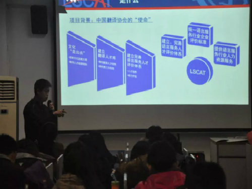 为适应新经济下国家对翻译人员的需求,中国翻译协会启动LSCAT项目以针对行业人才进行综合培养。从实际出发,由我院学习部主办的中国翻译协会语言服务能力评估(LSCAT)讲座于12月1日下午在8号教学楼216教室举行。LSCAT专业指导老师孟现朋担任主讲,各年级同学积极到场听讲。