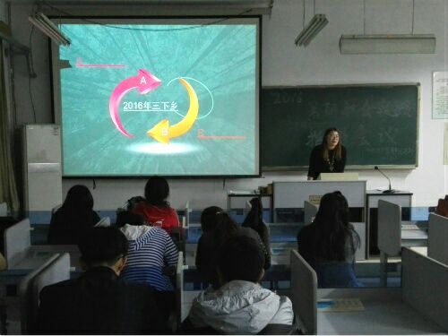 随后,她重点讲解“三下乡·千村行动”项目。该项目主题为“助力扶贫,筑梦齐鲁”,要求全校大学生充分发挥智力优势,以人才扶贫、公益扶贫及省内1000个贫困村为重点对象,开展内容丰富、形式多样的志愿服务活动。她详细讲到如何填写项目申请表、申报条件及具体截止日期。讲解过程中辅以范例,使得同学们思路清晰、明了。会议最后,她简要说明暑期社会实践要求,鼓励同学们身体力行,杜绝抄袭现象,使大学生活丰富多彩。