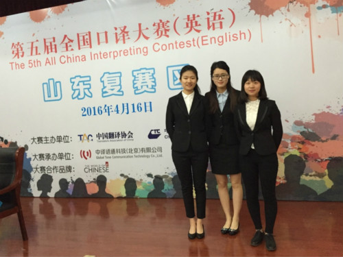 2016年4月16 ,“第五届全国口译大赛(英语)”山东赛区复赛于山东省外事办公室外事服务大厅举行。我校外国语学院英语1201班毕淑珍、英语1204班贾璐瑶、英语1203班郝亚琳三位同学荣获优秀奖,外国语学院毛毳老师获优秀指导教师奖。