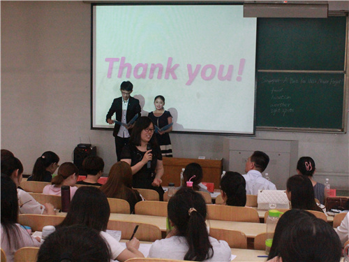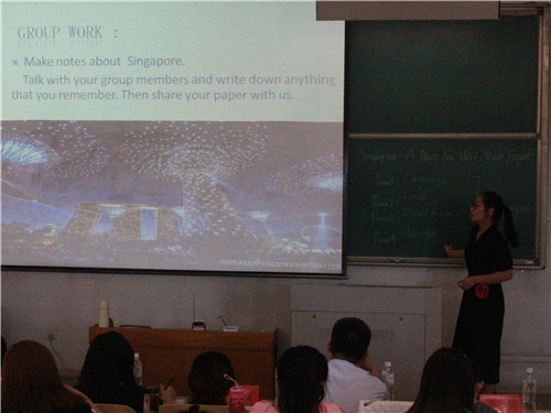 主持人介绍完比赛形式及评分细则后,选手依次上场。此次比赛的教学主题为“Singapore --A Place You Will Never Forget ”。各位选手均从容走上讲台,以PPT 展示为主,辅以板书展示授课内容;通过视频、音乐、图片等展示方式模拟真实教学环境,活跃课堂气氛;采取对话、提问、小组讨论等教学方法充实授课内容,层层递进,引导学生掌握授课知识。选手们授课思路清晰,重难点突出,教课风格各有千秋;发音标准,口齿清晰,语速适中,板书工整,有效互动,均成为赛场上的亮点。选手讲课结束后,张学文及陶新慧对选手的表现做出精彩点评。最终,来自英教1301的辛毅摘得桂冠,第一名有机会获得老师推荐名额参加山东省师范类高校学生从业技能大赛,其他选手分获二、三等奖。