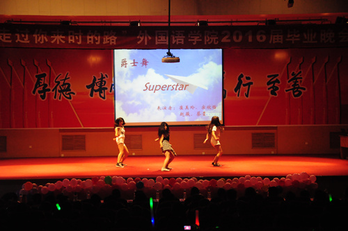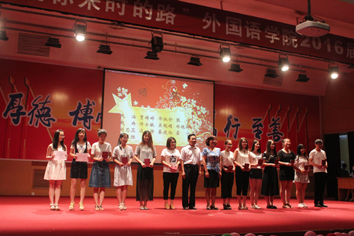四年时光飞逝过,一朝欢聚话真情。又是一年毕业时,6月22日晚,我院2016届毕业生晚会于3号报告厅举行。迈点教育咨询有限公司总经理李凯,上海外语教育出版社大区经理李海峰,学院党总支书记李义勇,院长、党总支副书记李静出席晚会。学院副院长卢连伟、王明新、牛书田,办公室主任辛延龄,教学科科长于志涛,团总支书记、学生科科长曹晓媛,辅导员吴鹏、朱岩,各系主任及2012级班级导师携2016届毕业生共同参加晚会,一起走过来时路,回忆四年青春。