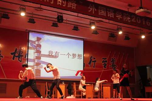 路线二中,学院日语外教护城惠昭倾情演绎日语歌曲《世界上唯一的花》,暖心发放美味巧克力,送上对毕业生的祝福。同学们挥舞手中的荧光棒,彩灯缤纷,交相辉映。情景剧《梦想起航》先幽默后深情,将同学们的“梦想”结合时下流行元素进行夸张表现,最后又以真情流露给人启迪。相声《满腹经纶》中,日新曲艺社成员诙谐风趣的的语言令观众们捧腹大笑。