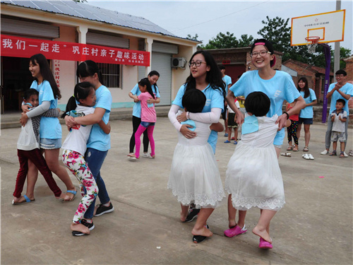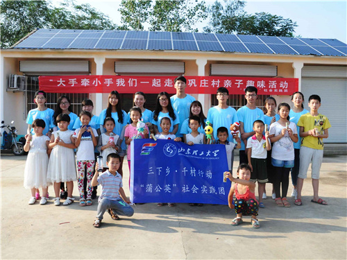 为积极结合课堂教育与实践教育,7月15日下午,我院“蒲公英”社会实践团“大手牵小手·我们一起走”素质拓展活动于德州市武城县李家户镇巩庄村举行。“蒲公英”社会实践团成员与孩子们两两随机组成游戏搭档,参与素质拓展活动。