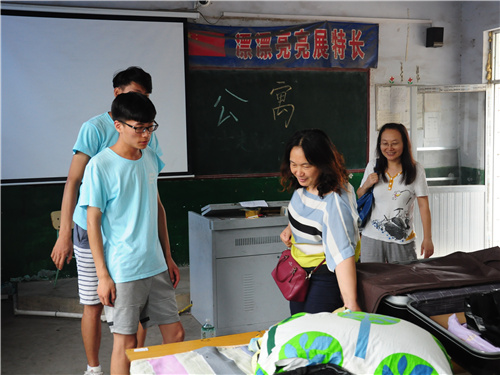 当天下午,朱艳红等人来到实践团队驻地——李家户镇中心小学。了解到实践团成员艰苦的居住环境,朱艳红赞叹实践团成员客服艰苦环境开展社会实践的苦干与实践精神,并亲切地与他们就住宿情况展开交流,勉励他们继续发挥理工学子风范,排除万难,为当地民众做实事。