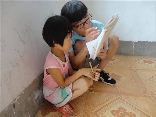 石板铺就的小路,周边长满了蓊蓊郁郁的苍翠草木。不住的蝉鸣喧嚣地闹着每一个应当是寂静空旷的午后。毒辣的太阳好像要撕裂每一寸土地,膨胀的空气随时可能在耳边炸响。而我们的队员,仍脚步匆忙地穿梭在大街小巷,寻找一家维修店,因为电动车和我们闹别扭了。终于找到一家能帮我们的店,热情的大姐帮我们捯饬了半天,终于搞定了。临走给她钱时,却怎么都不收,笑着说道“你们支援我们的孩子,我们当然要支援你们,再有什么麻烦事,过来找姐”,原来她的孩子就跟着我们学习。那一刻,我终于清晰地看到了这两年的区别,不仅是孩子,我们和村民的关系也渐渐拉近了。