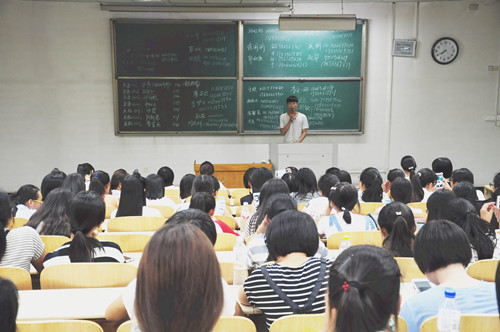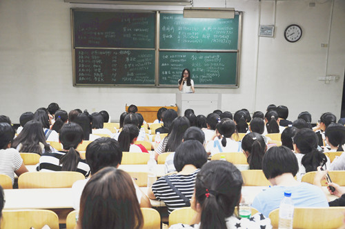 随后,学生会负责人为新生们介绍各班级责任教室及其班级导师,叮嘱他们参加次日的班级导师见面会。同时,她提到新生应提高防范意识,拒绝接受推销类的学习资料,还向新生介绍了有关英语学习材料、新生缴费卡介绍、办理电话卡三方面的事宜。在同学们热烈掌声中,此次会议结束。