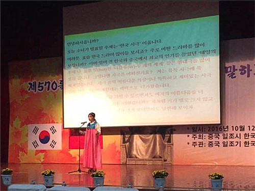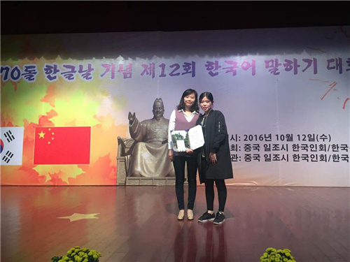 10月12日,由中国日照市韩国人会·韩国商会举办的纪念韩国文字诞生570周年暨第十二届韩语演讲比赛在日照市山东外国语职业学院落下帷幕。外国语学院2013级朝语专业学生刘香雪摘得榜首,荣获第一名“世宗大王奖”。第二名、第三名分别被烟台大学、山东科技大学同学收入囊中。