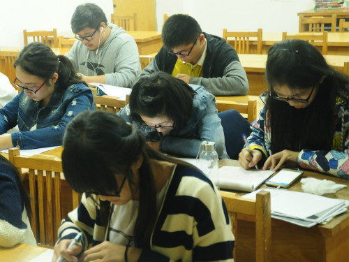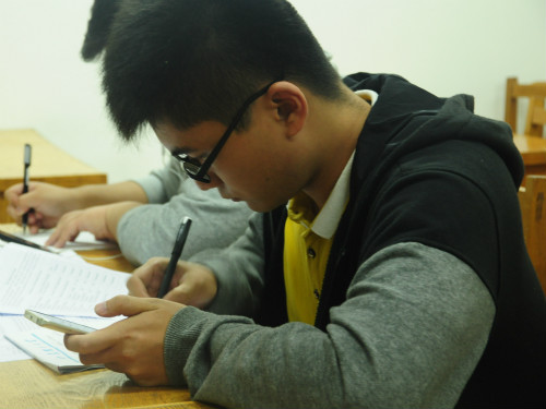 赛时,在纸上挥洒思维,聚精会神地陈列对辩题的看法。