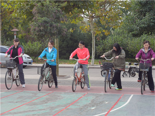 慢骑自行车项目中,几位女教师们娇小的身躯孕育着极强的力量。她们正单腿撑地,使自己与自行车融为一个整体,为接下来的比赛做准备。