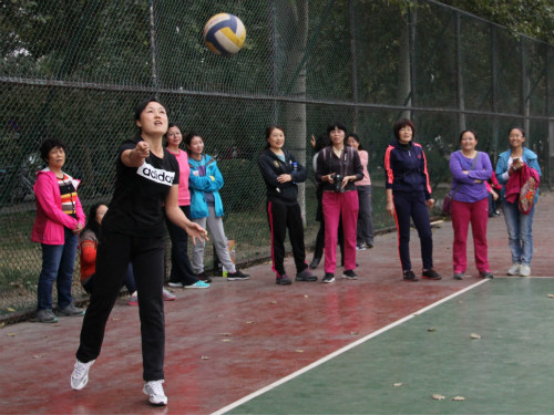 在二体排球场进行的排球发球比赛也吸引不少同学的关注。排球在空中画出一个优美的弧线时,观赛教师们相继露出肯定的笑容。