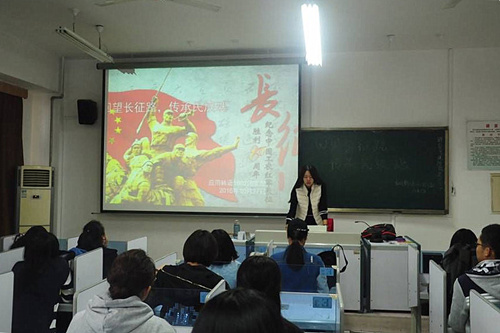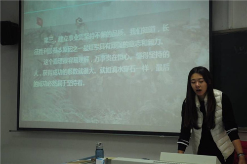 第一阶段,班级相关负责人借助PPT,为同学们讲述了红军主力由于第五次反围剿失败,从长江南北各区向陕甘革命根据地的战略转移经过。四渡赤水、巧渡金沙江、抢渡大渡河、飞夺泸定桥、翻越夹金山……跟随着团课负责人的讲解,同学们重回长征之路,一览红军最终胜利会师并过草地北上的风采。