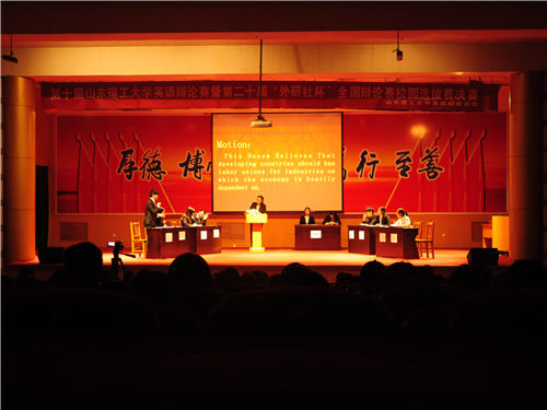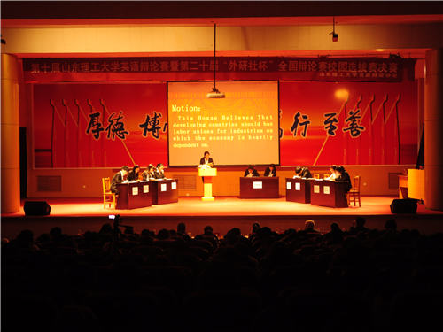 此次比赛采用英国议会制辩论形式。赛前,大屏幕上播放从淘汰赛到循环赛的照片视频,加深在场观众对赛事及参赛选手的了解。比赛正式开始,主持人现场公布题目“This House Believes That developing countries should ban labor unions for induatries on which the economy is heavily dependent on ”,辩手们在限定时间内据题写出思路,准备发言。辩论中,发言辩手眼神专注,思维敏捷,陈述己方观点,或侃侃而谈,循序渐进,或摆明态度,直击论点;讲台两旁等待发言的辩手则认真听取对手观点并进行记录,以便提出反驳意见。比赛过程气氛紧张,观众在辩手陈述环节领略其卓越风采,在质询过程中见识了唇枪舌战的激烈场面。所有选手发言完毕,各位评委老师离场讨论比赛结果。期间,学院社团成员献上独唱《告白气球》与对唱《她说》,缓解现场紧张气氛。