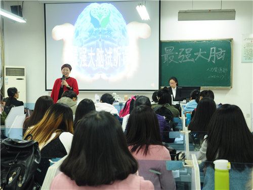 课程中,王君娜为同学们讲授人脑记忆的规律,展示如何快速有效记忆事物。首先,她由几个简单例子引出此次课程“你永远不知道自己的大脑有多强”的主题。简单的64个表格中放入无规律的数字或字母,奇妙的人脑探索之旅从这里开始。授课过程中,王君娜与学生们积极互动,现场教同学们掌握快速记忆无规律单词的方法。当记忆数字和字母时,同学们有的闭目深思,回忆所学内容;有的目视前方,思考记忆技巧。
