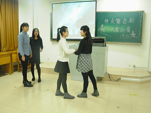 为丰富课余生活,提高学生对语言学习的兴趣,12月1日晚,外国语学院于8号教学楼304、308教室举行第十届外文舞台剧大赛初赛。此次比赛由学院外文之声协会主办,学院优秀学生代表担任评委。对舞台剧表演感兴趣的同学积极参加比赛。
