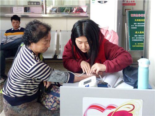 志愿者在规定时间准时到达淄博市妇幼保健医院,在与导医台的医护人员进行简短沟通后,正式开始服务。医院大厅人影匆匆,很多家属由于着急,难以静下心仔细观看科室平面图,志愿者成员及时上前帮忙指引,耐心解说。测量血压时,志愿者们与大爷大妈们简单沟通几句,引导他们坐正身体,将胳膊放在仪器的指定位置,以更好地准备测量。在按下机器按钮,等待读数的过程中,志愿者也留神提示他们在测量期间尽量不要说话或使情绪有起伏。