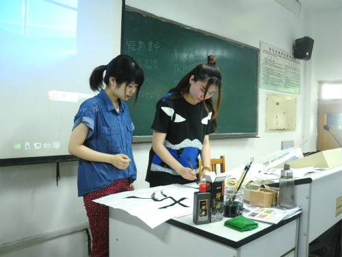在讲座接近尾声之际,日语1601班的张萌代表同学们现场写毛笔字送给角田老师,以表达对其的感谢,角田祥子也回赠一个“友”字以示对同学们的友好之情。