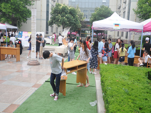 在此次活动中,有这样一群身影,他们身着蓝色T恤,穿梭在人群中,散落在活动的各个角落。对他们而言,风情街中的美食、表演区的歌舞都不属于他们。他们在不起眼的地方默默地为此次活动贡献自己的一份力。6月9日下午他们便来到外国语学院,为活动的进行积极做好准备。