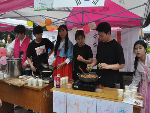 美食区分为欧美大餐、日韩料理、中式美食和民族特色四个板块。许多学生前来品尝精心制作的各式美食,部分摊位前有身着民族特色的迎宾,为每位前来品尝的同学提供周到的服务。