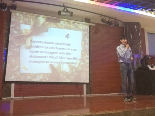 随后,其余5名选手继续进行自备演讲。第一环节结束后,丁宁对各位选手的语音语调、语速、肢体语言进行细致点评,并给出相关改正建议。然后,各选手依次进行限时1分钟的即兴演讲。即兴演讲话题涉及高考、同性恋、早恋等社会热点话题,选手们看到题目后立即组织语言进行简短陈述。他们从容地应对各类话题,展现出较高的语言组织能力。第二环节结束后,彭静对各选手表现进行点评。她充分肯定各选手的参赛勇气与现场发挥能力,并鼓励同学们积极参加比赛,通过比赛锻炼自己的英语能力。最后的表演环节结束后,主持人公布比赛结果。最终,谷丰、刘子林获得一等奖,王璇、王明欣、陈璐、牛婷婷获得二等奖,林倩倩、于倩、张亚丽、智鹏宇、初庆兴获得三等奖。