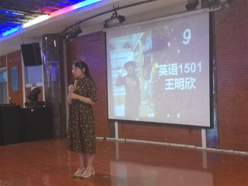比赛伊始,主持人致以简短的开场白,并就比赛规则及评分标准进行说明。继而,参赛选手依次进行自备演讲。他们的演讲主题各种各样,有的纪念翻译家许渊冲,有的纪念作家、翻译家杨绛;有的诠释小人物亦可以有大梦想,有的诠释沉默的父爱。从这些选题中可见各位选手充分重视此次比赛,并为之努力做准备。他们在演说时或辅以眼神交流,或辅以肢体语言,以充分诠释主题,达到与观众共鸣的目的。前6位选手演讲完毕后,为缓解现场比赛氛围,英语1502班学生彭右兴带来才艺表演。