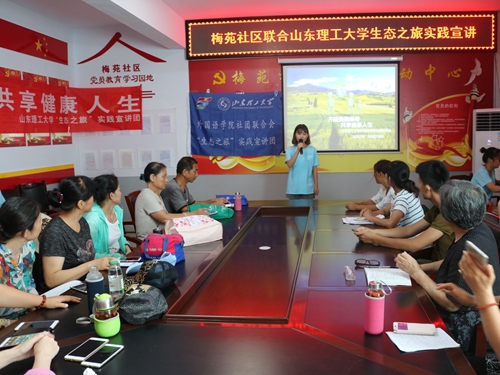 为向人民群众传递“美丽中国”理念,提高居民的生态保护意识,7月15日,外国语学院“生态之旅”实践宣讲团来到淄博市张店区科苑街道梅苑社区,进行生态环保主题宣讲。此次宣讲以“齐绘‘美丽’画卷,共享健康人生”为主题,梅苑社区居委会工作人员参加此次宣讲活动。