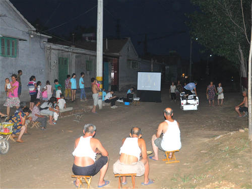 了解到村民们娱乐活动较为匮乏,“蒲公英”社会实践团特意从学校带来投影仪,在此之前已为村民放映过一次电影,并收到村民的一致好评。此次电影的播放地点仍选在村里一个宽阔的路口,一则方便召集村民,二则地势开阔,播放效果较好。投影仪准备就绪,幕布上映出电影画面,此时的村民们均有些激动,满脸期待,期间有三两位大爷小声感叹科技成果给人们生活带来便利。