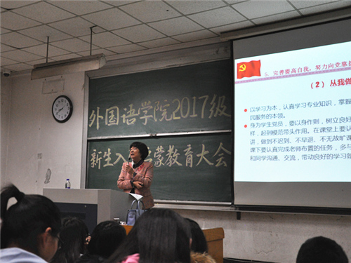 11月2日晚,外国语学院于3号教学楼111教室举行2017级新生入党启蒙教育大会。学院党总支书记李静,团总支书记、学生办公室主任王伟出席会议,李静担任主讲。该院2017级全体新生参加。