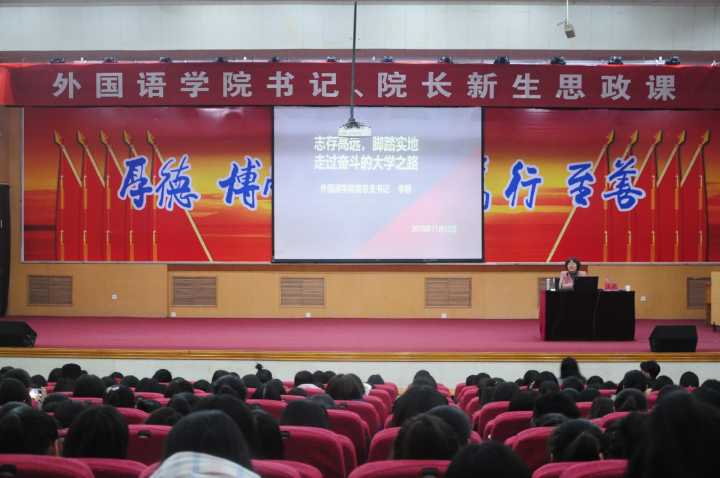 为激励新生树立理想抱负,培养务实精神,坚定理想信念,11月12日晚,外国语学院在3号教学楼报告厅举行书记、院长新生思政课,此次思政课由学院党总支书记李静主讲,党总支副书记姜素锦主持,学院学生干部及2018级学生参加。