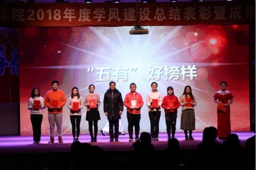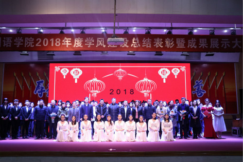 12月25日晚,“凝心·尚学·逐梦——我院2018年度学风建设总结表彰暨成果展示大会”于三号教学楼报告厅举行。校党委常委、副校长张祥云,蓝海国际教育集团理事长鲁晓宁,学校有关部门负责人、外国语学院领导班子成员及各系室负责人、师生代表400余人参加大会。