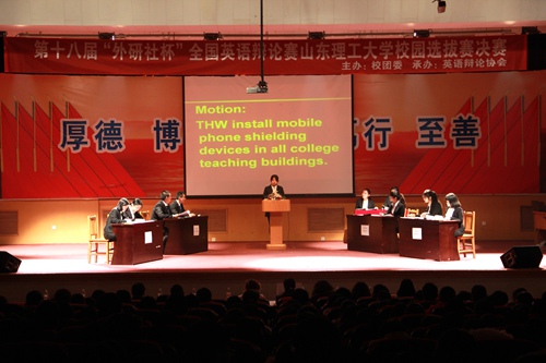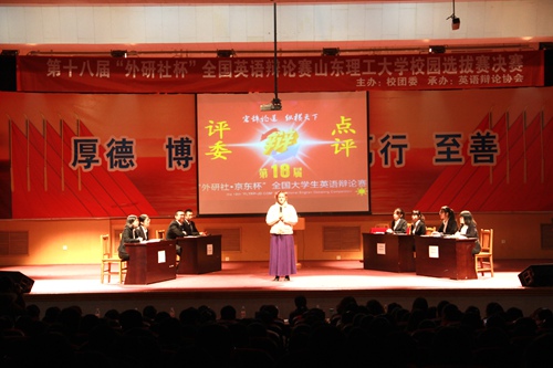 为锻炼并提高大学生的逻辑分析能力、理性思辨能力及问题解决能力,由校团委主办、英语辩论协会承办的第十八届“外研社杯”全国英语辩论赛山东理工大学校园选拔赛决赛于11月18日晚在3号报告厅举行。外国语学院党总支副书记卢彦峰,副院长王明新,全国英语辩论赛指导教师、团总支书记、学生科科长曹晓媛等应邀作为此次比赛的嘉宾。外教高明馨,外国语学院英语一系主任、副教授张燕,英语二系副主任杨宁,副教授、英国威尔士大学硕士研究生张蕾及优秀教师、英国威尔士大学访问学者乔伟荣等担任此次比赛的评委。