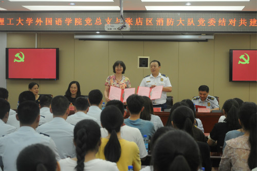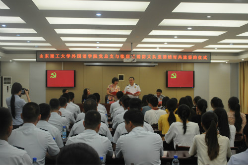 为庆祝建党98周年,提升基层党组织建设水平和师生党员的党性修养,通过组织共建、党员联动、活动联办、人才联育、资源联用等方式为党组织建设开辟新阵地与新载体,7月1日下午,外国语学院党总支与淄博市张店区消防大队党委结对共建签约仪式暨主题党日活动于淄博市张店区消防大队举行。淄博市消防救援支队张店区大队政治教导员徐超、外国语学院党总支书记李静、党总支副书记姜素锦、副院长张燕及消防大队全体官兵、学院师生党员代表参加,消防救援支队张店区大队副大队长韩利群主持此次活动。