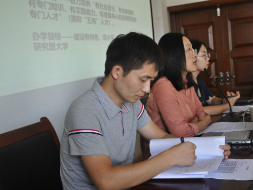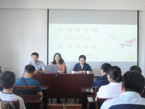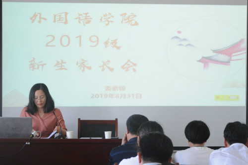 8月31日下午,外国语学院在8号教学楼418教室举行2019级新生家长见面会。会议由学院党总支副书记姜素锦、2019级辅导员阴祖宝和刑琛以及部分新生家长共同参加。