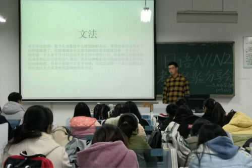 11月17日晚上,外国语学院在8号教学楼116教室举行日语N1N2考级经验分享会。此次活动由学院学习部主办,优秀学生秦凯、闫逸飞、黄姝菡主讲,日语专业学生积极参加。