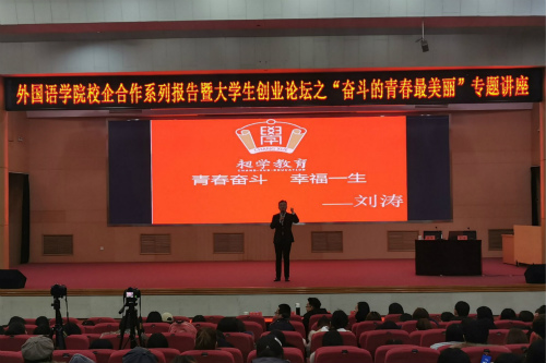 为提升大学生的综合素质,激发大学生创新实干的热情,12月5日下午,外国语学院在三号教学楼报告厅举行校企合作系列报告暨大学生创业论坛之“奋斗的青春最美丽”专题讲座。山东昶学教育集团创始人、淄博蓝海国际教育培训学校校长刘涛受邀担任主讲人,山东昶学教育集团市场总监孙建民、人事总监麻翠翠,学院党总支副书记姜素锦及学院学生会成员、班级骨干参加,讲座由辅导员朱岩主持。