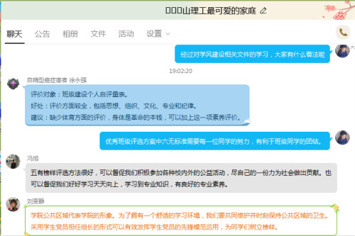 班会开始,各班团支书组织全班学生认真阅读学风建设相关制度,探讨现有制度的可行性和不足之处。《班级建设个人自评量表》、《“优秀班级”、“特色班级”评选方案》、《班级目标建设责任书》、《班级建设年度评价体系》有利于学生建立班级集体荣誉感,增强班级的凝聚力,激发学生投身班级建设的积极性;《公共区域值日制度》、《学生骨干奖励资助管理办法》、《学生骨干负面清单》则从思想、工作、学习、生活等方面对学生干部提出严格要求和奖惩措施,有利于进一步加强学生骨干队伍建设,督促学生骨干正确行使职权、履行义务,充分发挥模范带头作用;《学生宿舍管理办法》、《学生请销假管理办法》维护学生正常的学习生活秩序,强化学生安全管理,促进大学生的健康成长与成才;《“五有”榜样评选办法》进一步引导学院学生自觉将“五有”人才培养目标确立为自身成长发展的目标,激励广大学生看齐榜样、超越榜样,营造优良院风、学风。学生们在学习制度的同时,踊跃提出部分制度的不足之处和局限性,群策群力,积极讨论,线上班会气氛活跃。最后,各班级团支书将学生提出的对于学风建设的建议汇总上交至学院。至此,此次主题班会圆满结束。