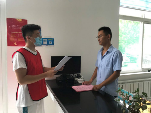 7月27日,外国语学院“青·展翼”社会实践团队员胡永正和杨晓婉分别在淄博恒星社区和线上微信平台采访疫情防控志愿者们。