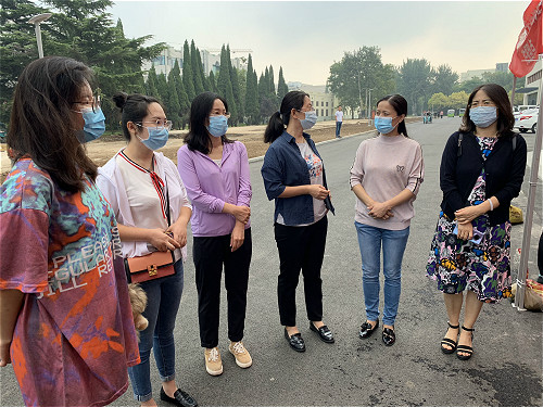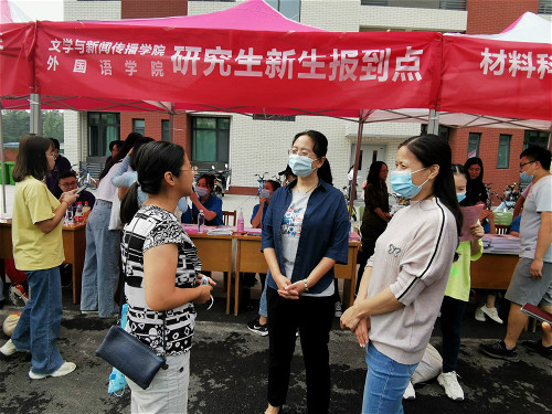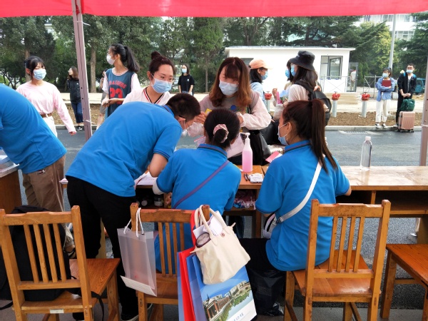 外国语学院的各位领导和老师早早在此准备,辅导员邢琛老师在返校报到点组织了学生志愿者帮助新同学搬运行李;校园公交“小绿龙”来往奔波,把学生送到所在公寓。身穿“研究生院”字样蓝色体恤的学长学姐早早来到迎新现场,一个个身影穿梭在报到处与宿舍楼之间,传递外院情谊。各位学长学姐井井有条地收取、核验新生证明文件,同时发放校园卡、新生入学须知等重要文件,悉心指导,耐心解答新生问题。每一位学生都会经过手部消毒,各位学长学姐和老师更是全程佩戴口罩,严格按照学校的防疫要求办理报到程序。虽然流程冷静高效,但当学长学姐拎起新生行李的那一刻,我们就成为了一家人。