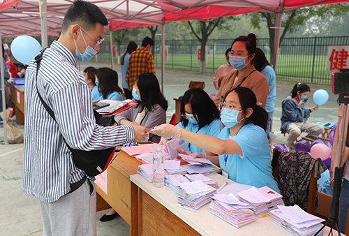 在迎新现场,每一位学生都会经过手部消毒,各位学长学姐和老师全程佩戴口罩,严格按照学校的防疫要求办理报到程序。工作人员井井有条地收取、核验证明文件,同时发放校园卡、新生入学须知等材料。