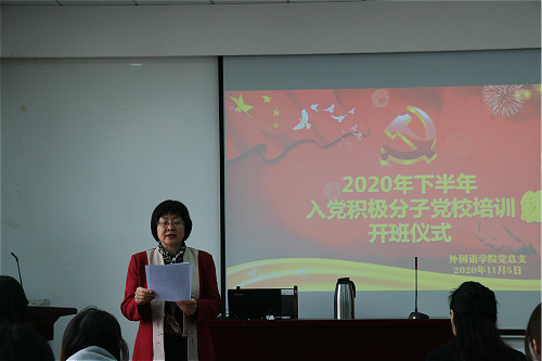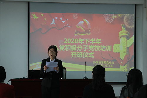 11月5日下午,外国语学院在8号教学楼418教室举行外国语学院2020下半年入党积极分子党校培训开班仪式。学院党总支书记李静、党总支副书记姜素锦、学院全体辅导员以及参加本次党校培训的74名入党积极分子参加了此次开班仪式,学院团总支书记、学生工作办公室主任周丽妲担任主持。