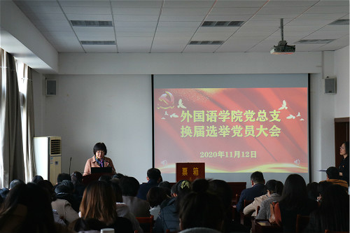 11月12日下午,外国语学院党总支于8号教学楼418教室召开全体党员大会,进行党总支换届选举工作。此次大会由学院党总支副书记姜素锦主持,学院全体师生党员参加此次会议。