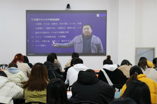 王阳首先向学生提出“我的专业是什么?学专业干什么?职业规划是什么?我的人生是什么?选择创业、就业、考研哪一条道路?如何真正走上创业、就业、考研道路?”等问题,并围绕所提出的问题,就外国语言专业的学生如何在创业、就业、考研道路上取得成功与学生进行探讨和指导,针对三条不同路径需注意的事项进行归纳和总结。