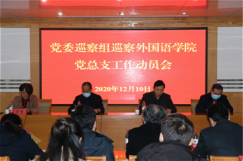 校党委巡察组副组长及有关同志,外国语学院领导班子成员、各科室负责人员、党支部书记、系主任、教授委员会主任、副主任,部分教师及学生党员代表参加会议。