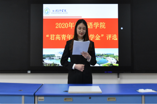 会议伊始,主持人从答辩要求、投票要求对奖学金评选工作作简要介绍。根据君高青年成长奖学金评选程序,经个人申报、初审评议,最终确定李萍等14名同学进入评选辩答环节。