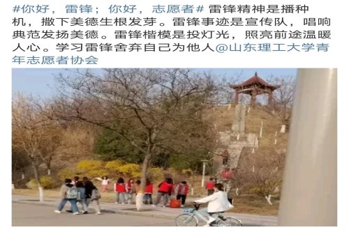 对于以集体组队的志愿服务,英语1903班的周腾飞拍摄下团队集体探望老人、为老人送温暖递爱心的照片,并附介绍“志愿服务是奉献社会,服务他人的一种方式,是传递爱心播种礼貌的过程”。此外,英教2003班的谭永正拍摄下志愿服务青年团队为校内树木浇水的照片,并附个人感悟“雷锋精神是播种机,撒下美德生根发芽;雷锋事迹是宣传队,唱响典范发扬美德;雷锋楷模是投光灯照亮前途温暖人心”。